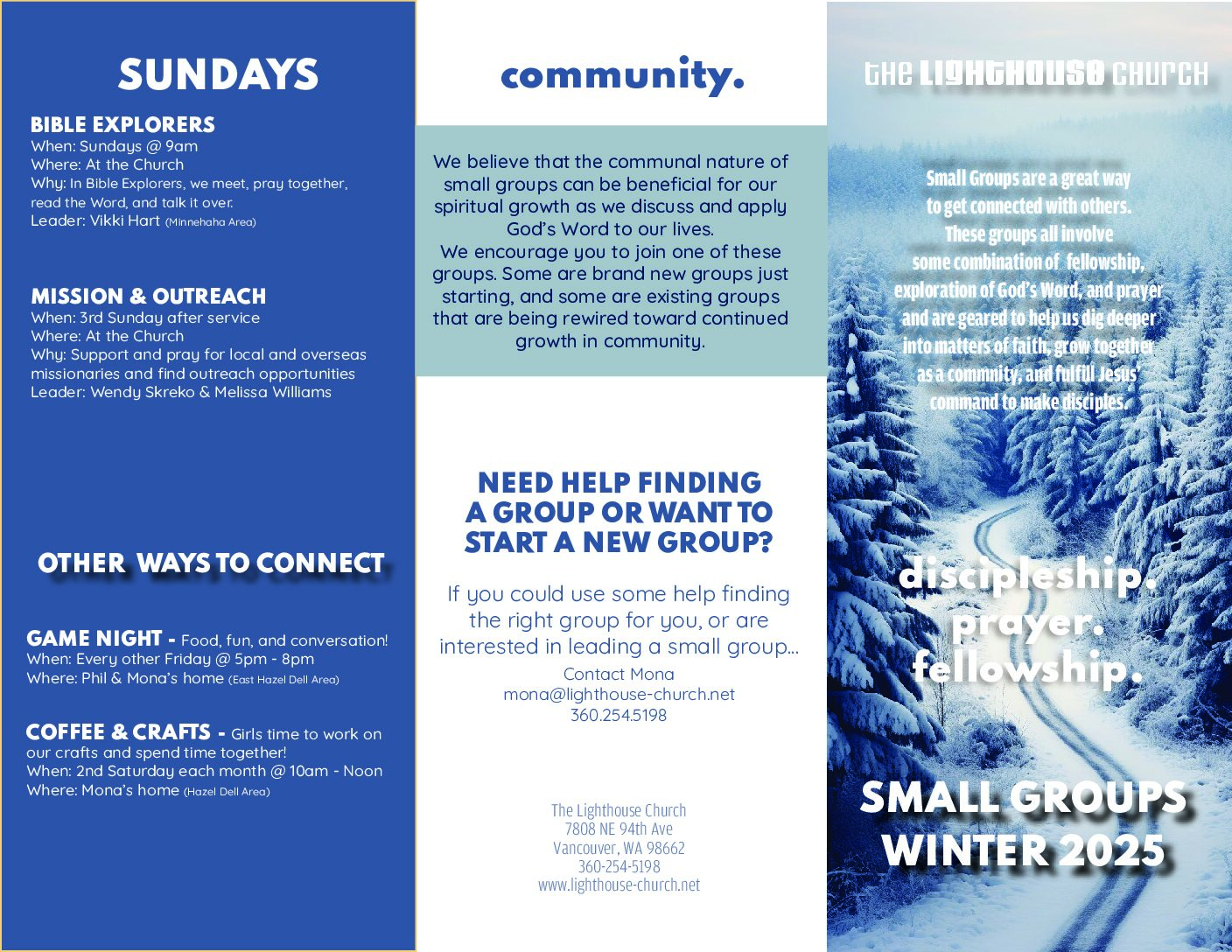 Why small groups? Small Groups are a great way to get connected with others. These groups all involve some combination of fellowship, exploration of God’s Word, and prayer and are geared to help us dig deeper into matters of faith, grow together as a community, and fulfill Jesus’ command to make disciples.
